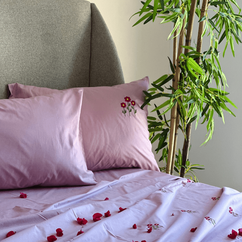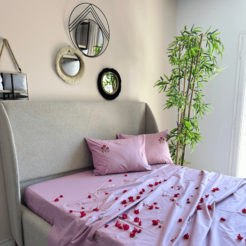 Parure de lit coton satiné 4 pièces – Tige : housse de matelas, drap plat et 2 taies d’oreiller brodées. Disponible en plusieurs couleurs et dimensions.
