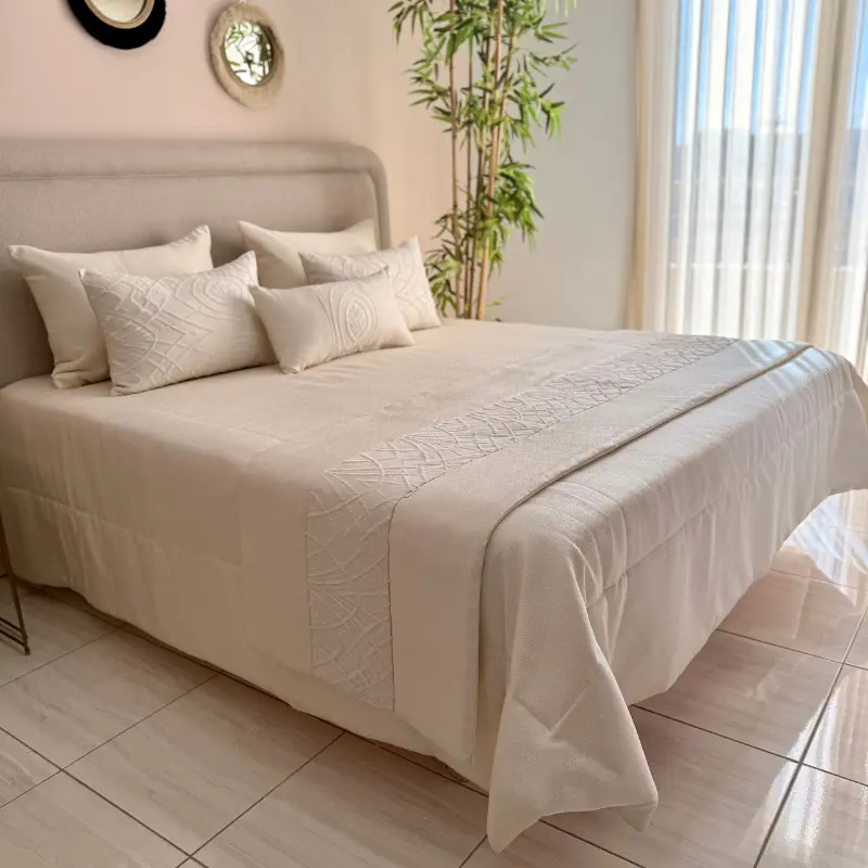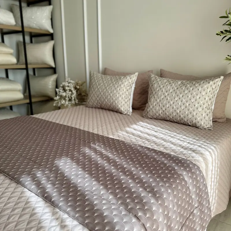 Couvre lit Automne Tunisie – Ensemble 7 pièces complet : couvre-lit, chemin de lit, 4 taies et coussin décoratif. Élégant, pratique et confortable pour toutes les saisons.