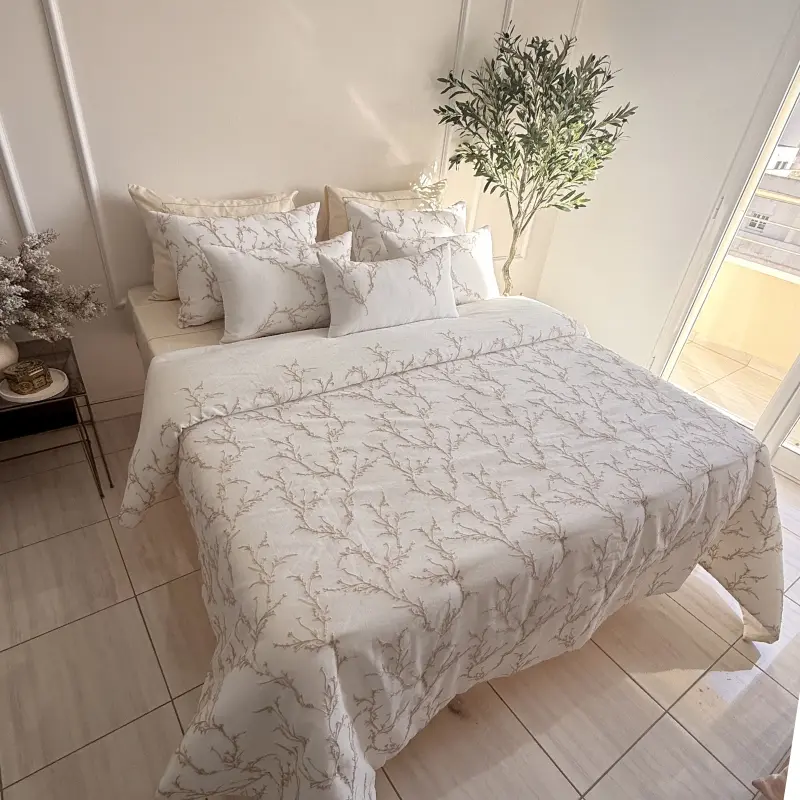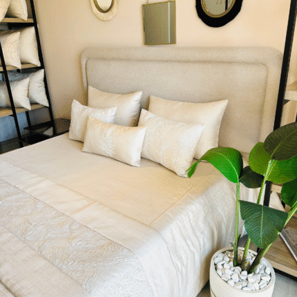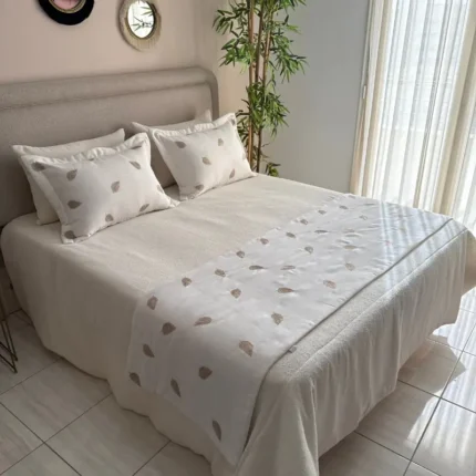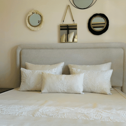 Couvre lit Emnoush brodé Kamraya 260×240 cm avec 5 taies assorties. Design chic et raffiné pour chambre élégante.