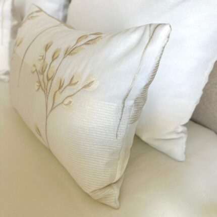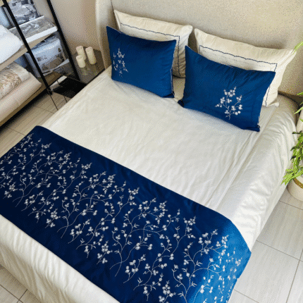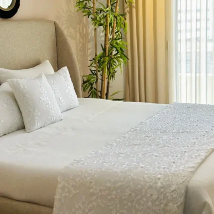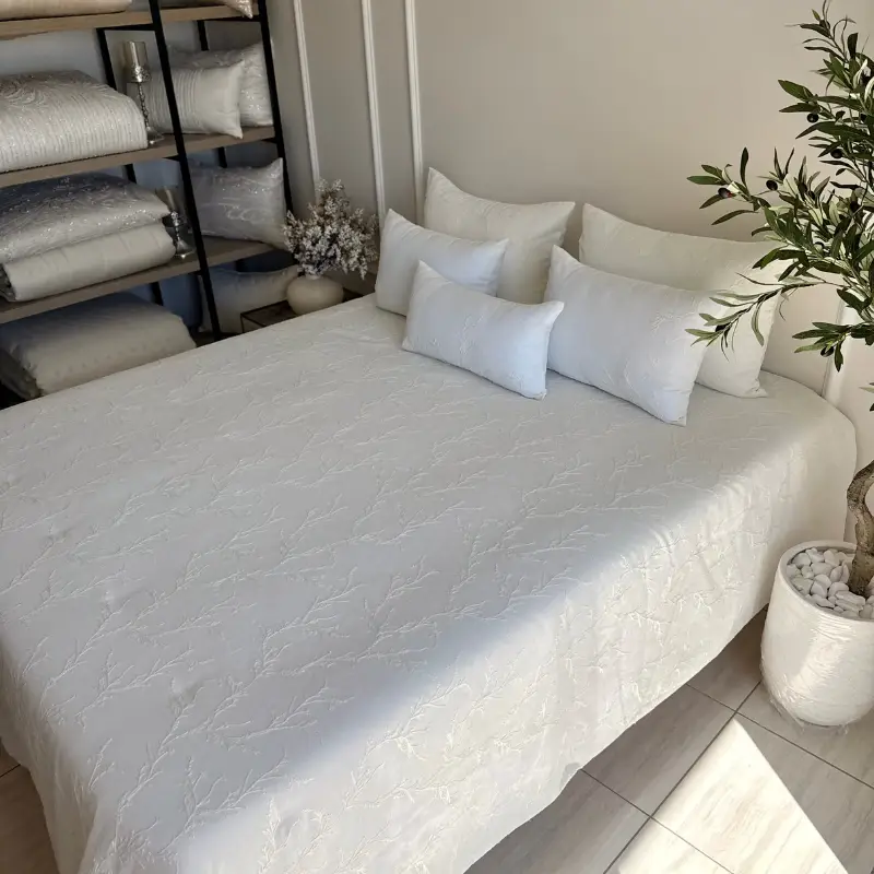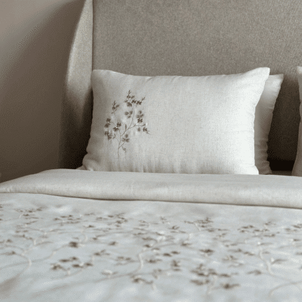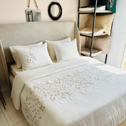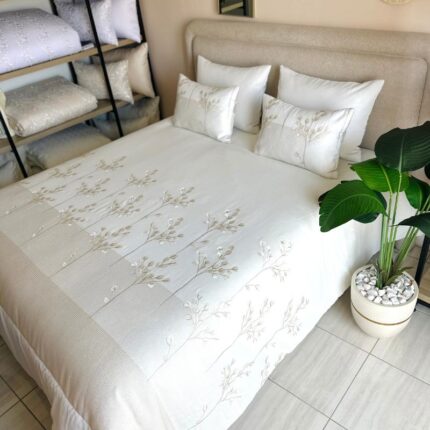 Couvre lit Assia brodé Kamraya 260×240 cm avec 5 taies assorties. Design chic et raffiné pour chambre élégante.